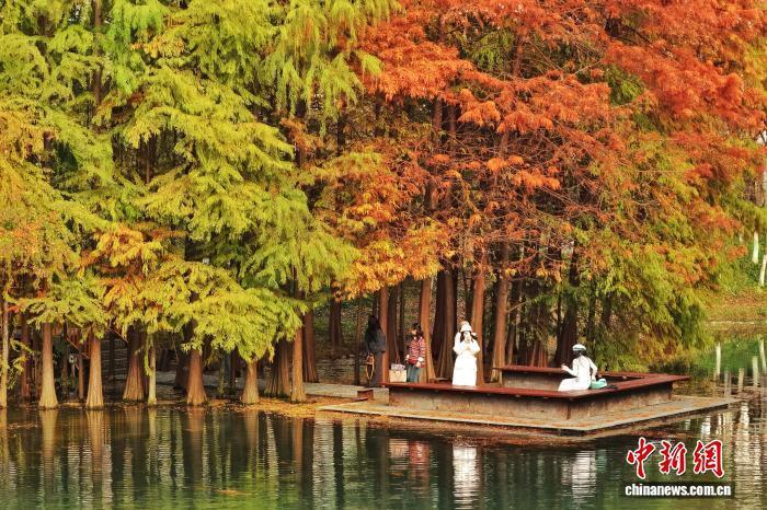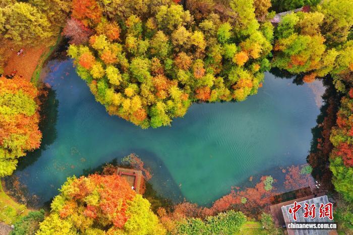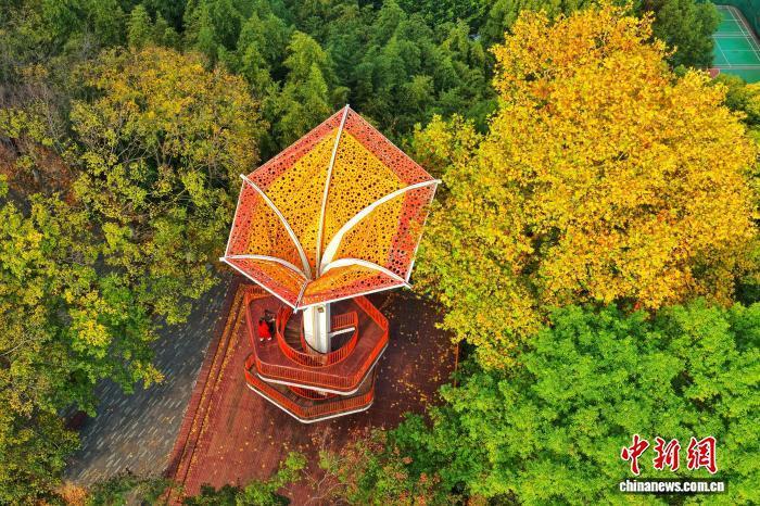 11月18日,从空中俯瞰湖北省宜昌市运河公园,彩林与湖水在冬日的阳光里熠熠生辉,吸引众多市民、游客前来赏景拍照。宜昌有“三峡门户”之称,近年来,该市在全国率先开展城市公园绿地开放共享试点,持续推动公园与城市的完美融合,让“推窗见绿、出门见园、四季见彩”成为现实。图为公园里的彩林与湖水相映成景(无人机图片)。周星亮 摄