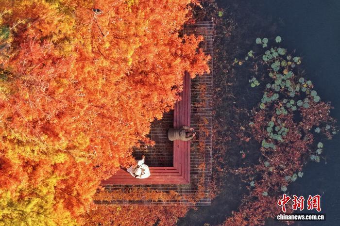 11月18日,从空中俯瞰湖北省宜昌市运河公园,彩林与湖水在冬日的阳光里熠熠生辉,吸引众多市民、游客前来赏景拍照。宜昌有“三峡门户”之称,近年来,该市在全国率先开展城市公园绿地开放共享试点,持续推动公园与城市的完美融合,让“推窗见绿、出门见园、四季见彩”成为现实。图为市民、游客在公园内赏景拍照(无人机图片)。周星亮 摄